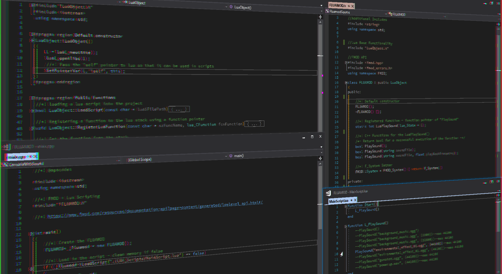 Play Game View Project FilesUsing the low-level FMOD API and Lua scripting, I was able to write in C++ the registered Lua function "PlaySound" to act like an overloaded function in C++. I was able to grab the count of arguments and their data types from the lua stack allowing me to pass on those values across to the corresponding C++ function. My aim with that was to keep the stack small and try to have most of the 'heavy lifting' done in C++.